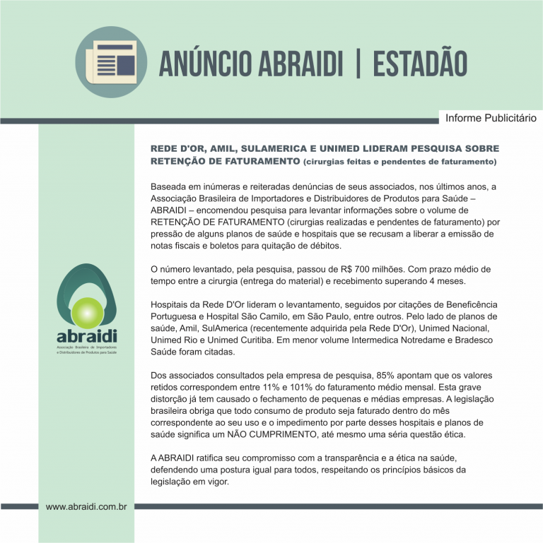 Baseada em inúmeras e reiteradas denúncias de seus associados, nos últimos anos, a Associação Brasileira de Importadores e Distribuidores de Produtos para Saúde