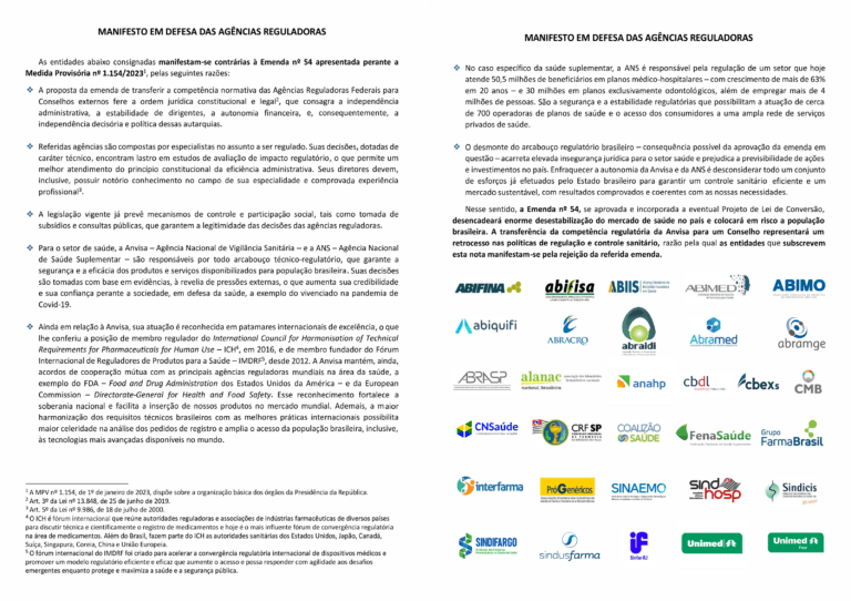 A Associação Brasileira de Importadores e Distribuidores de Produtos para Saúde e mais outras 30 entidades do setor de saúde assinaram o “Manifesto em Defesa