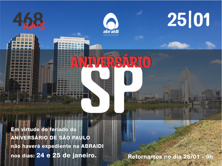 Em virtude do feriado do ANIVERSÁRIO DE SÃO PAULO não haverá expediente na ABRAIDI nos dias: 24 e 25 de janeiro.